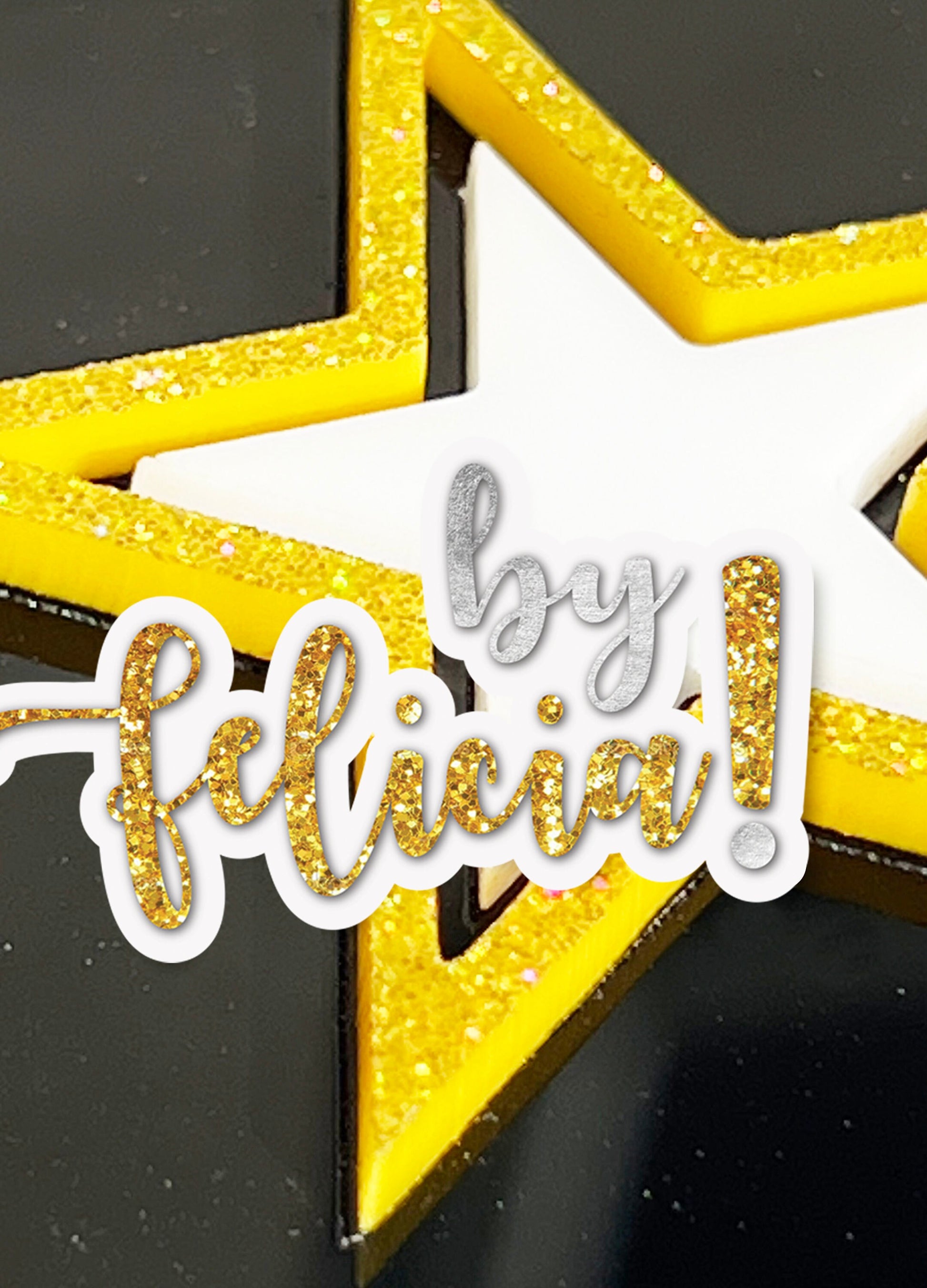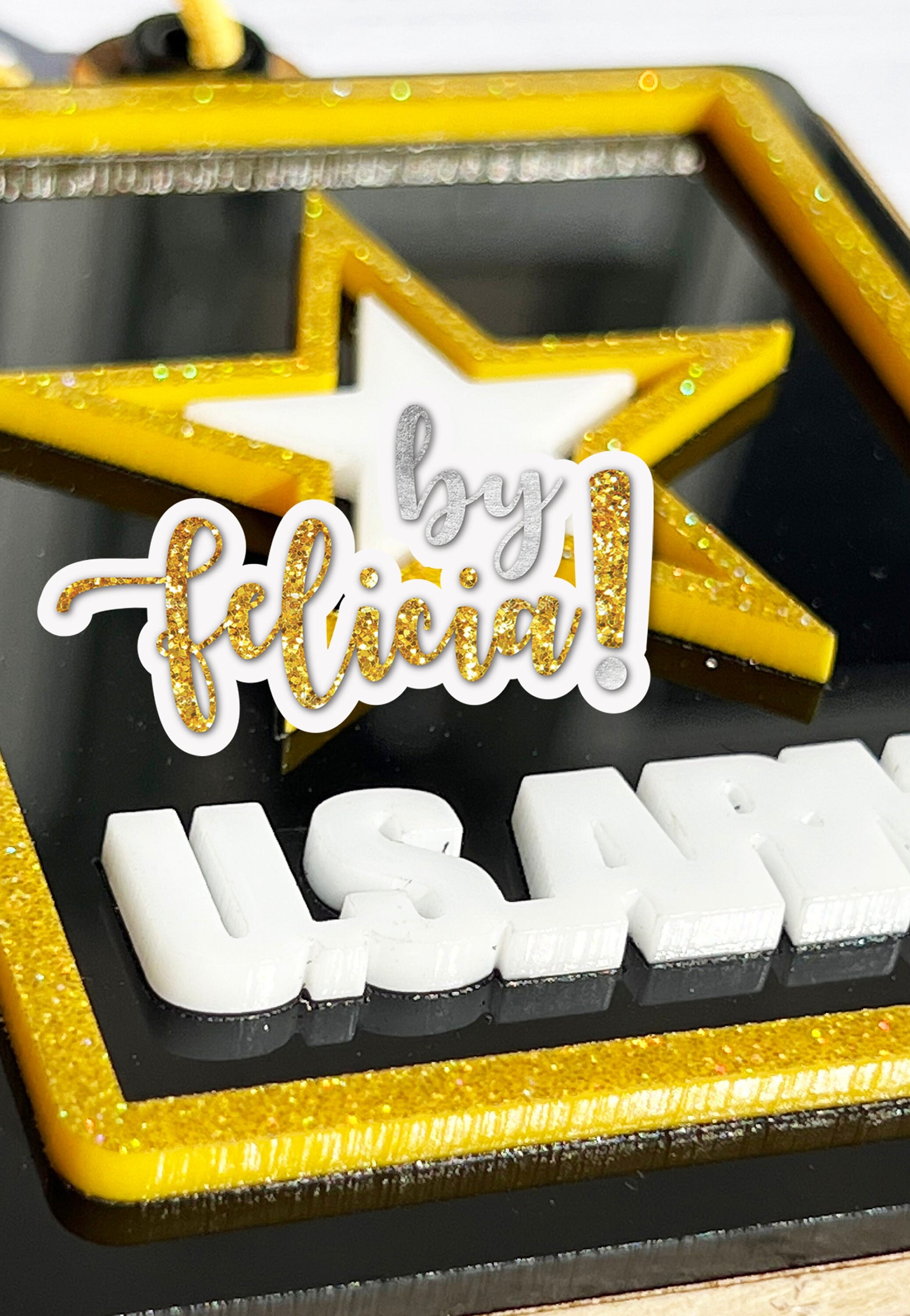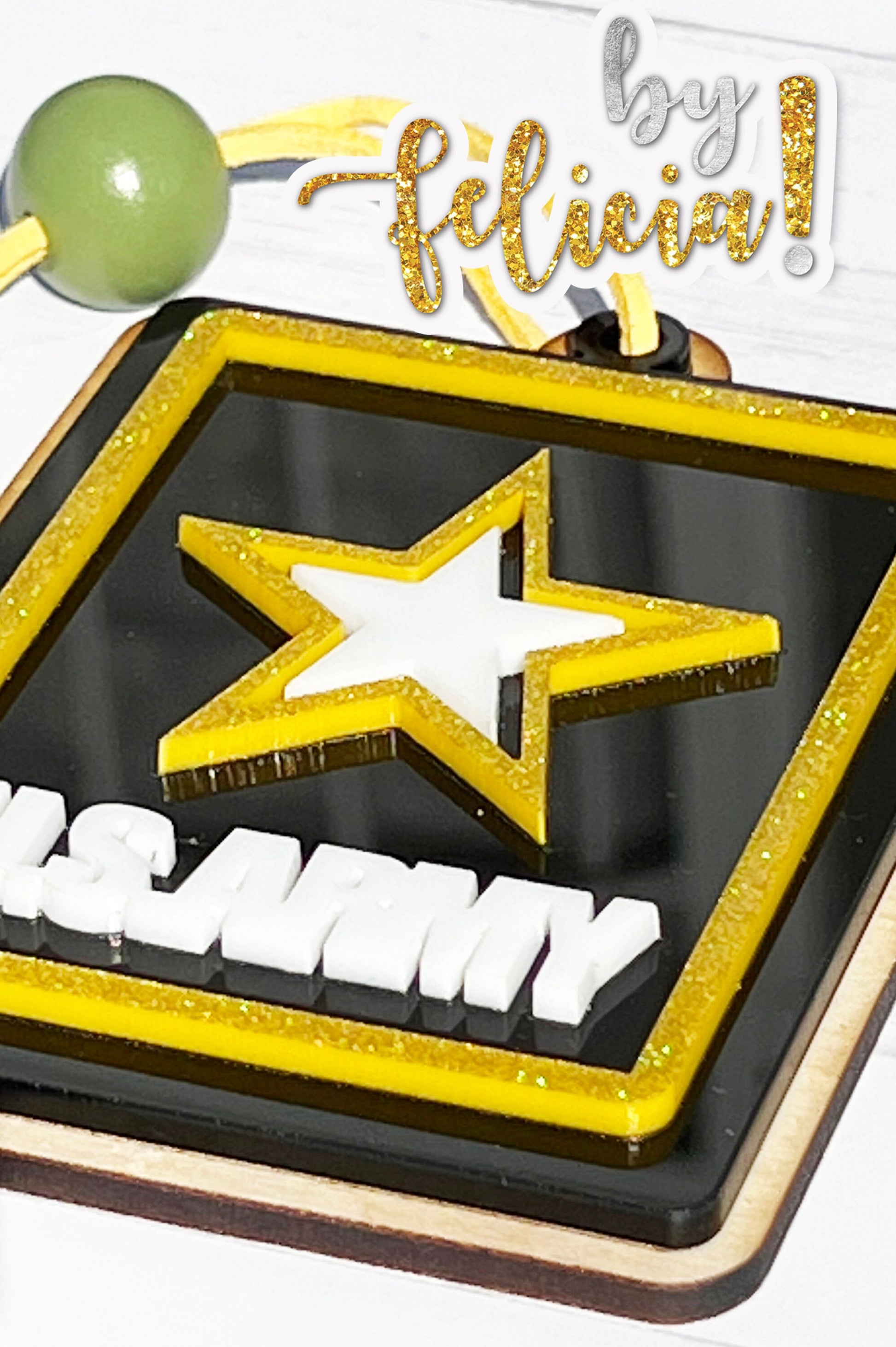 + This Army ornament is 3 layers and made out of 1/8" birch wood and 1/8" black, white, and gold acrylic.