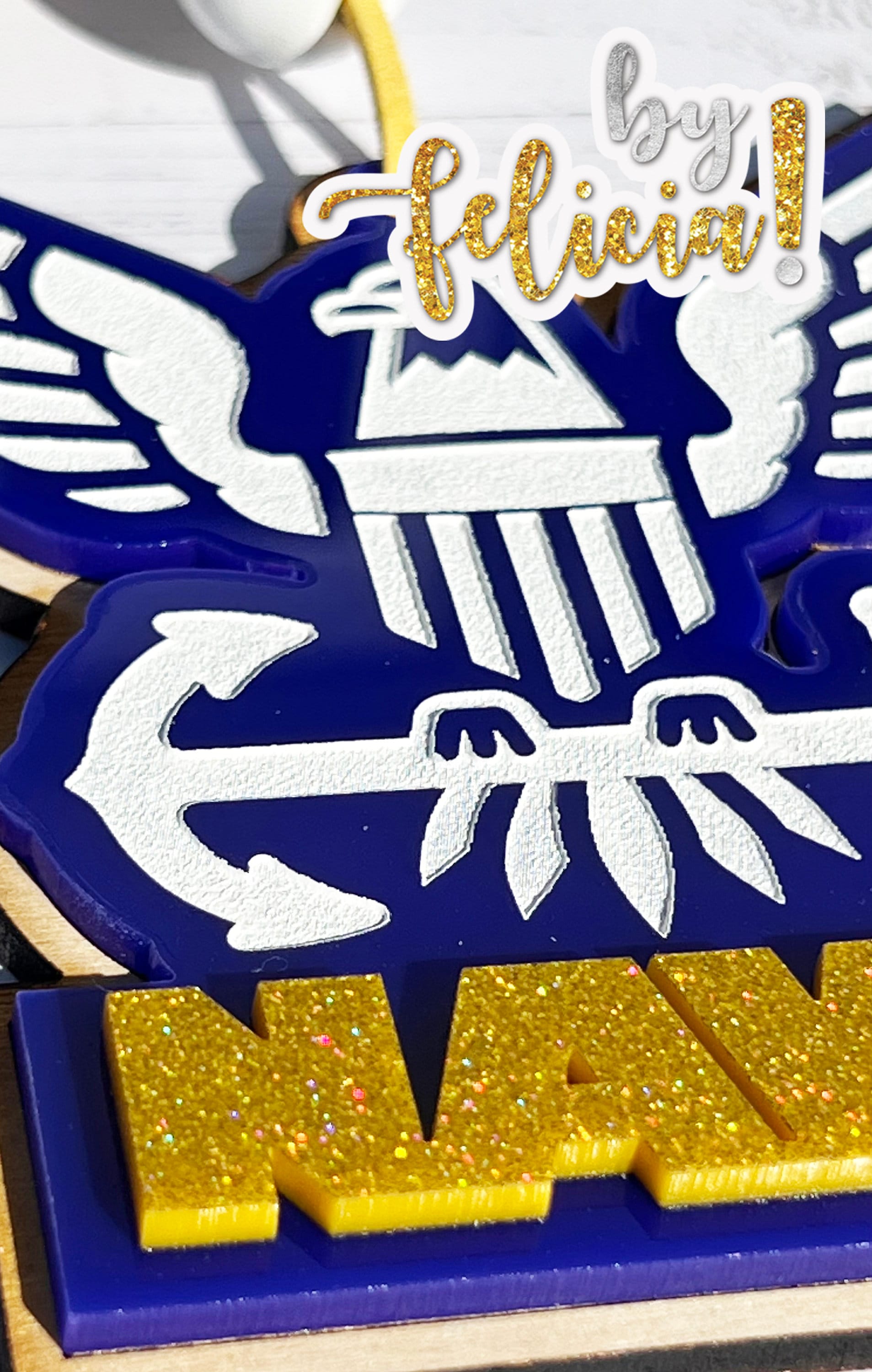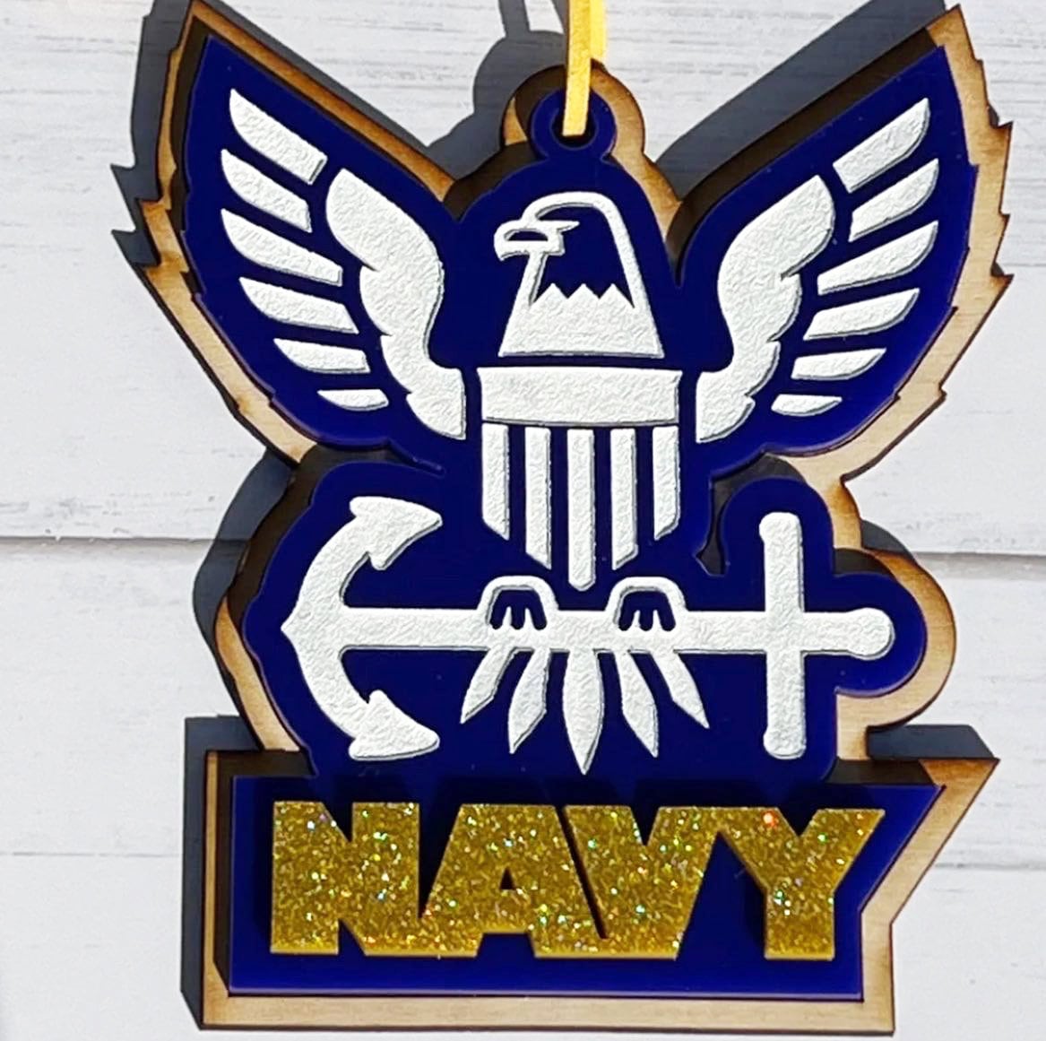 + This Navy ornament is 3 layers and made out of 1/8" birch wood and 1/8" blue and glitter gold acrylic.