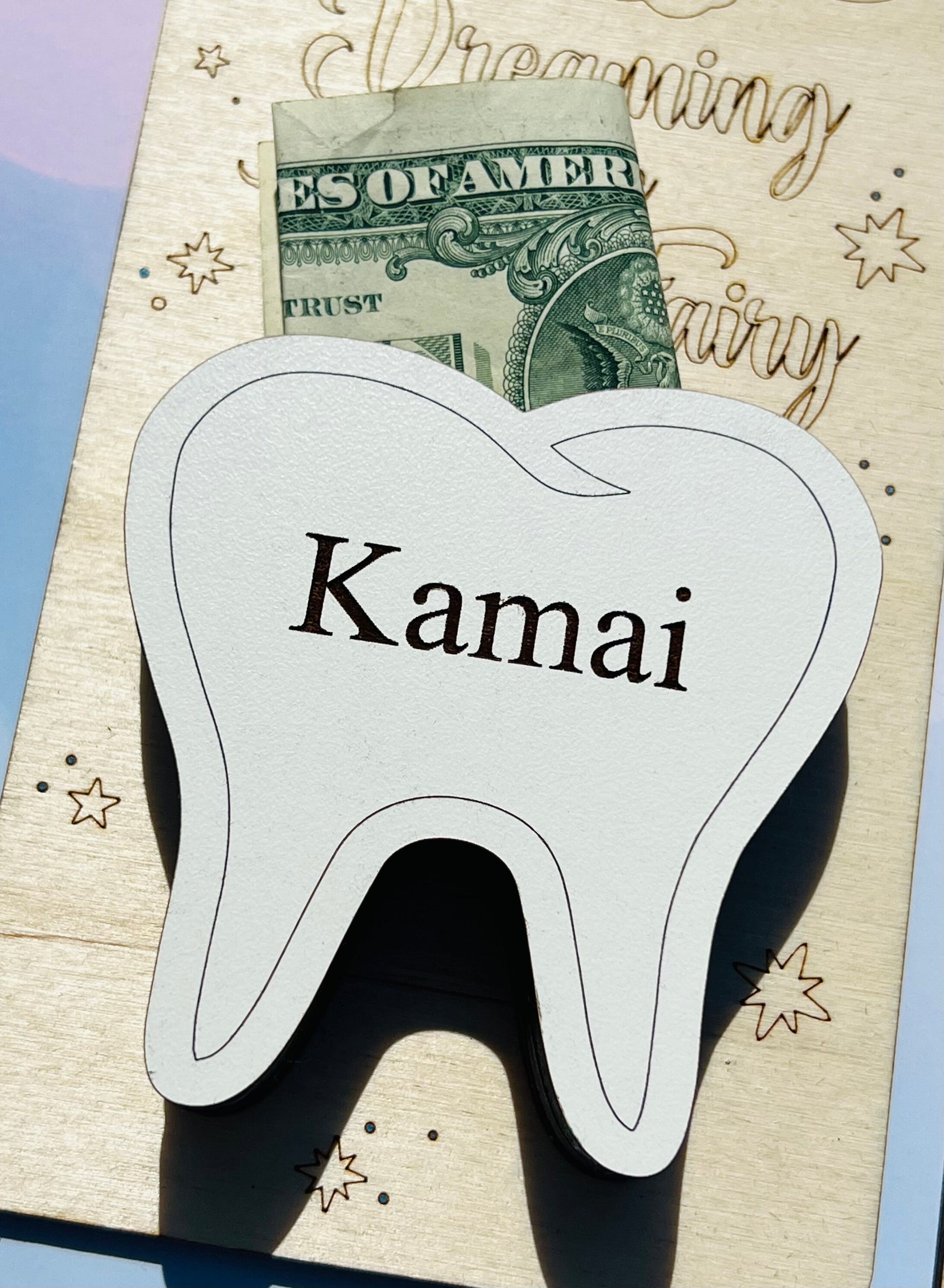 • Laser engraving includes the words "Dreaming of the Tooth Fairy" on the plywood